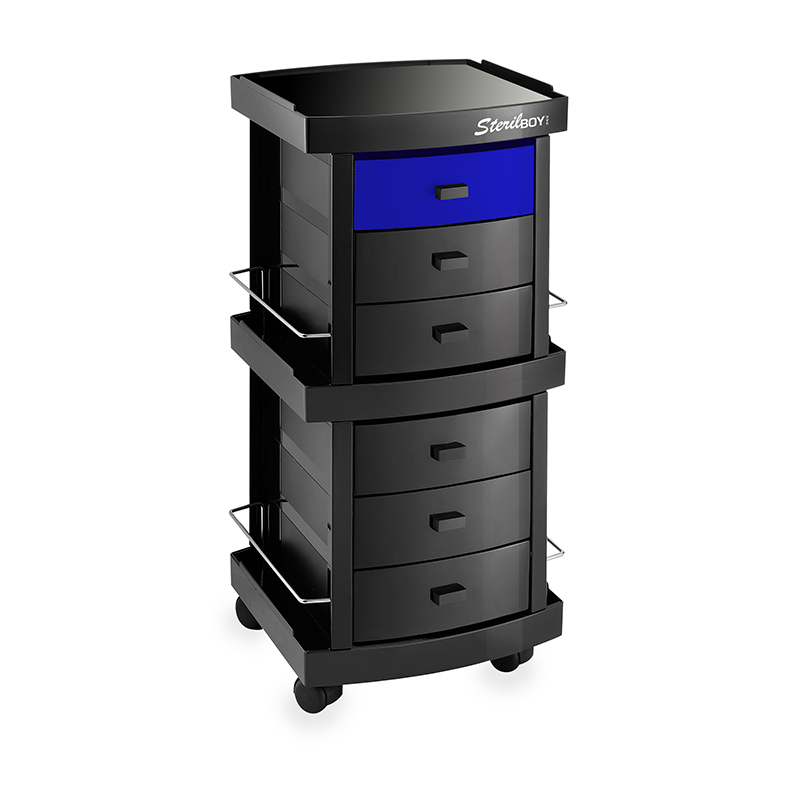 Парикмахерская тележка "SterilBoy" - оснащена УФ-лампой мощностью 9 Вт с бактерицидным действием. Санитарная обработка происходит только в первом ящике с выдержкой всего 10 минут. Используемые материалы устойчивы к УФ-лучам.