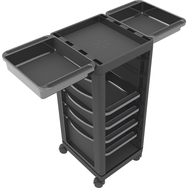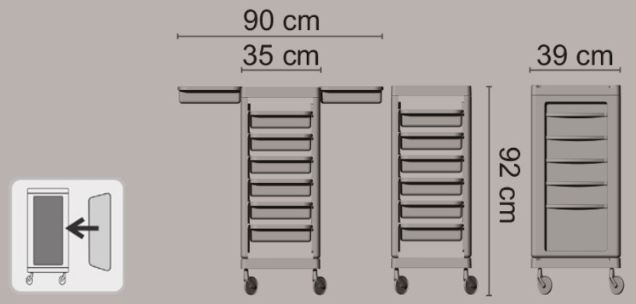 Тележка парикмахерская полузакрытого типа на колесиках. Выполнена из прочного пластика, имеет 6 выдвижных ящиков и возможность установки их сбоку тележки.