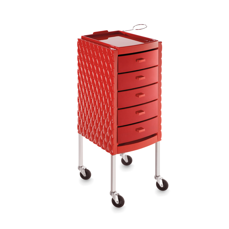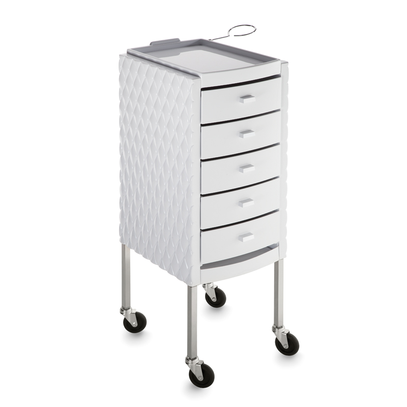 Тележка парикмахерская "DECORÌ" - новые ощущения для глаз и на ощупь, эффект капитоне создает современный и утонченный дизайн этой многофункциональной тележки с 5 выдвижными и съемными ящиками. Конструкция из термоформованного PST на основе из хромированной стали, резиновые колеса диаметром 70 мм с защитой от волосков, снижающие уровень шума до минимума, легко разбираются для легкой очистки. Ящики можно прикрепить к верхней части тележки, чтобы при необходимости иметь под рукой необходимые инструменты. Держатель для фена имеет фиксированное положение, чтобы горячий воздух от фена не попадал на концы тележки с артикулом A-м60003053, однако он съемный.