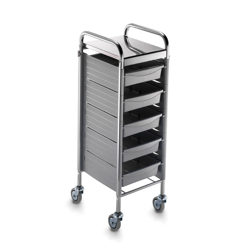 Тележка парикмахерская "KAPPA STEEL" - на хромированном каркасе из прочного пластика с пятью выдвижными ящиками. Оснащена прорезиненными колесами для комфортного  и бесшумного перемещения. Тележка с артикулом A-м60003039 имеет рабочую поверхность из нержавеющей стали.