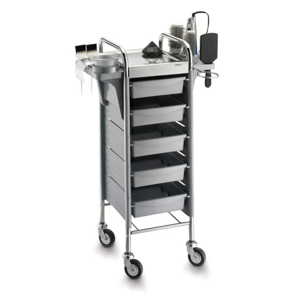 Тележка парикмахерская "KAPPA STEEL COLOR BRUSH" - на хромированном каркасе из прочного пластика с пятью выдвижными ящиками. Оснащена прорезиненными колесами для комфортного  и бесшумного перемещения. Тележка с артикулом A-м60003042 имеет рабочую поверхность из нержавеющей стали, 2 съёмных портативных лотка с металлическим фенодержателем, отделением под миски для окрашивания, держателем для фольги, а также отделениями для кистей и сопутствующих аксессуаров.