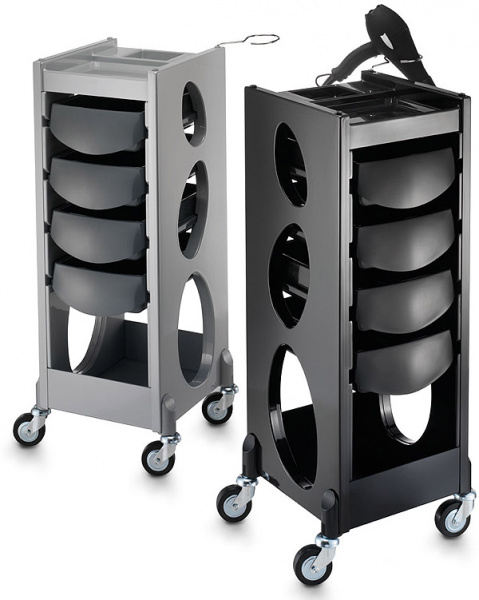 Тележка парикмахерская "TATTOO" - из прочного пластика с четырьмя ящиками и отделением под сумки. Оснащена прорезиненными колесами для комфортного и бесшумного перемещения, металлическим фенодержателем и отделением под сопутствующие аксессуары. Боковые стенки тележки с артикулом A-м60003038 имеют декоративные отверстия.