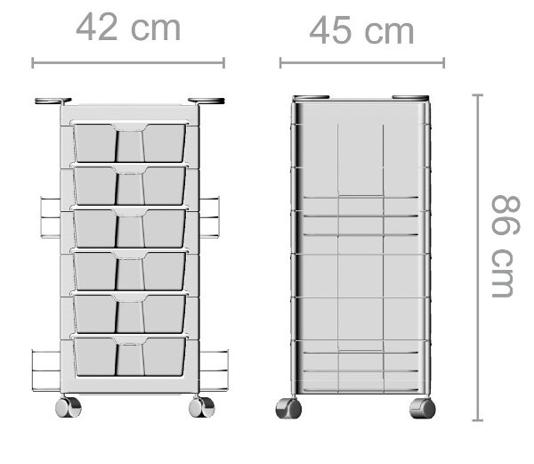 Тележка парикмахерская закрытого типа на бесшумных колесиках "NO HAIR". Тележка выполнена из прочного пластика. Тележка оснащена шестью выдвижными ящиками и съемными боковыми полками, предназначеными для хранения инструментов.