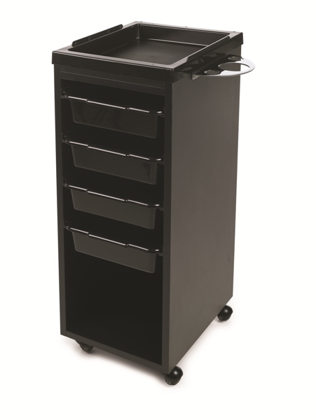 Тележка парикмахерская, выполнена из ламината матового черного цвета. Тележка оснащена выдвижными ящиками, фенодержателем и прорезинеными колесиками.